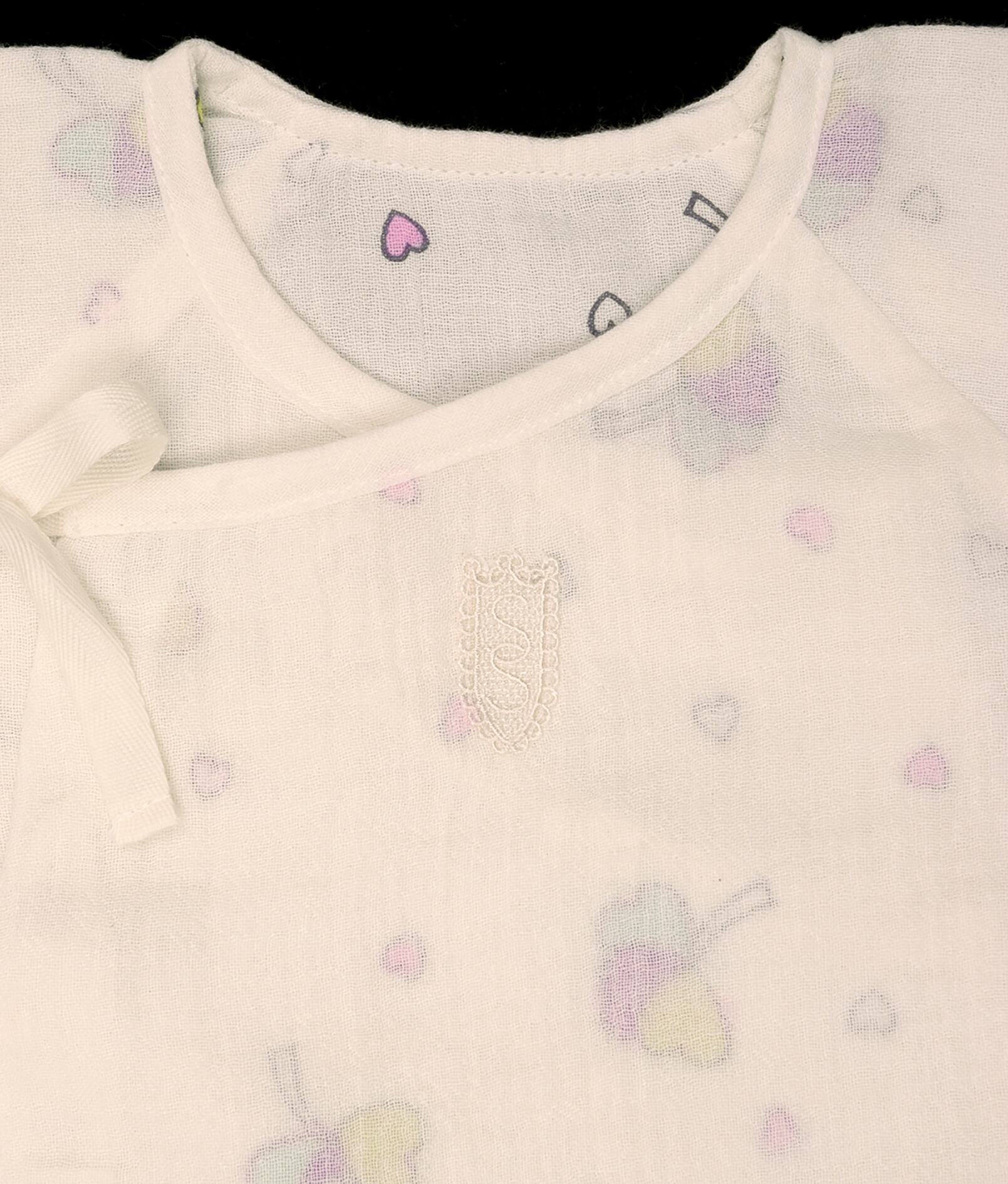 上前の前身頃には、オリジナルプリントの上に無地のガーゼを重ねてほのかに柄が透けて見えます。