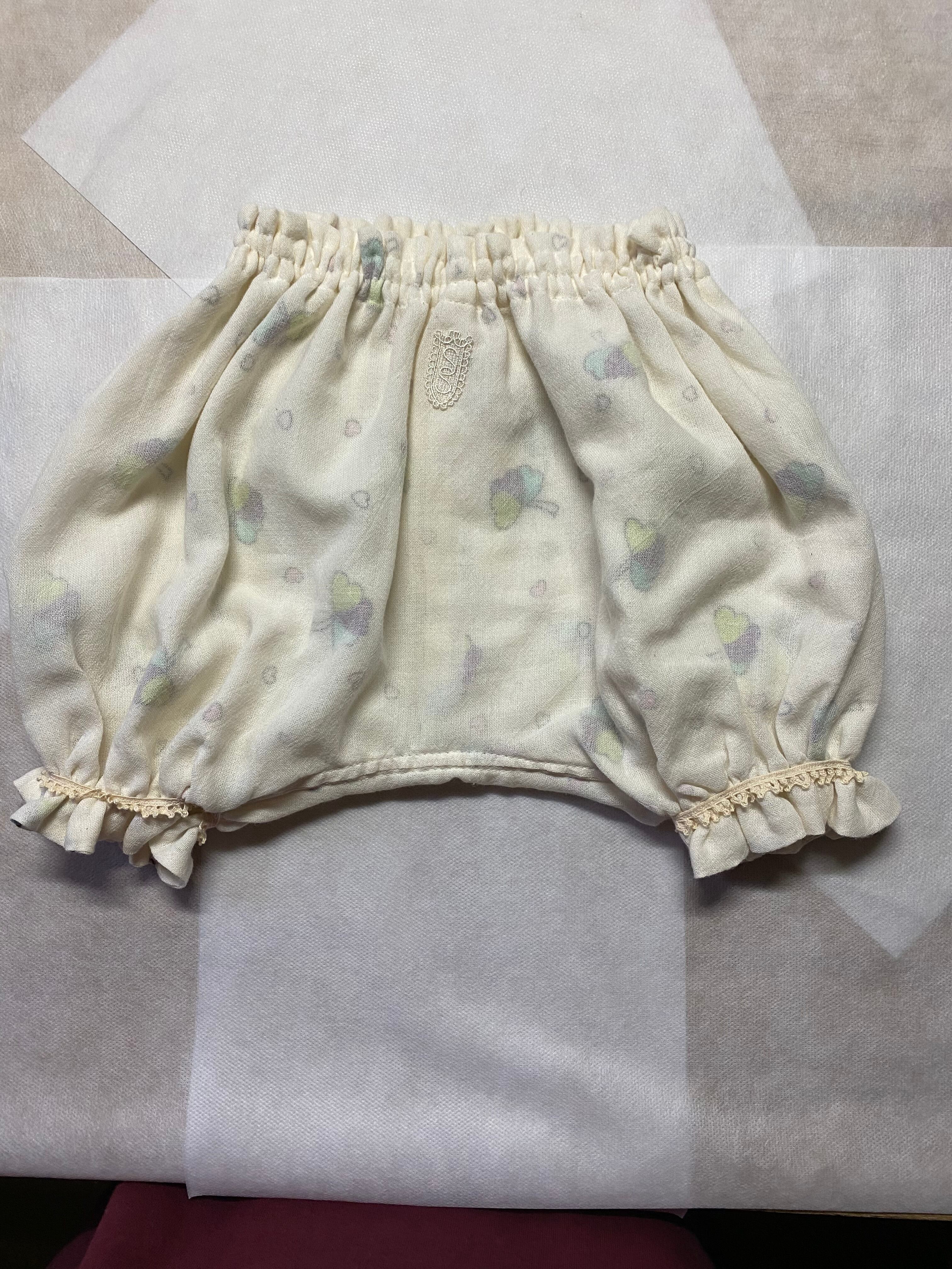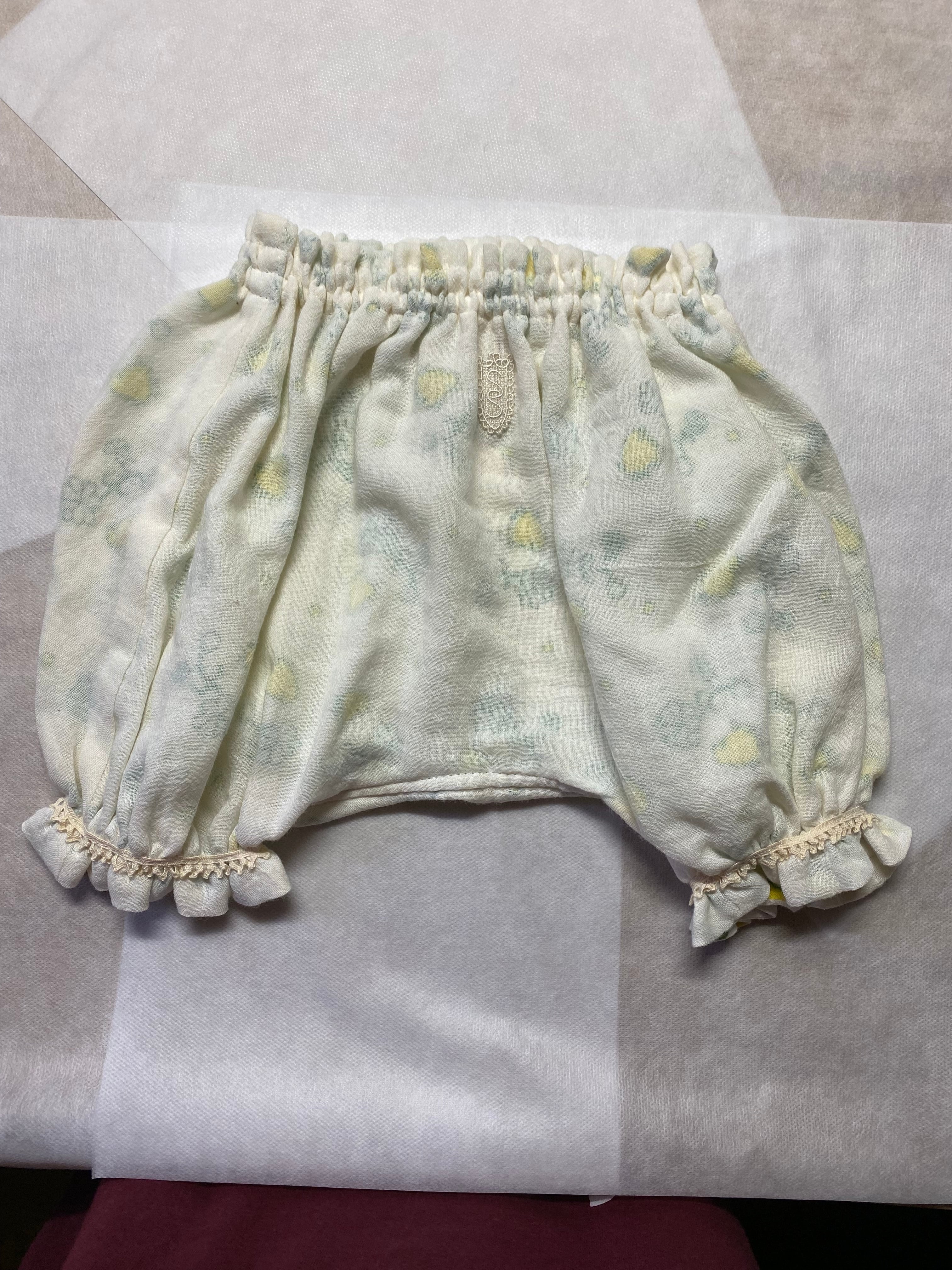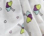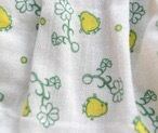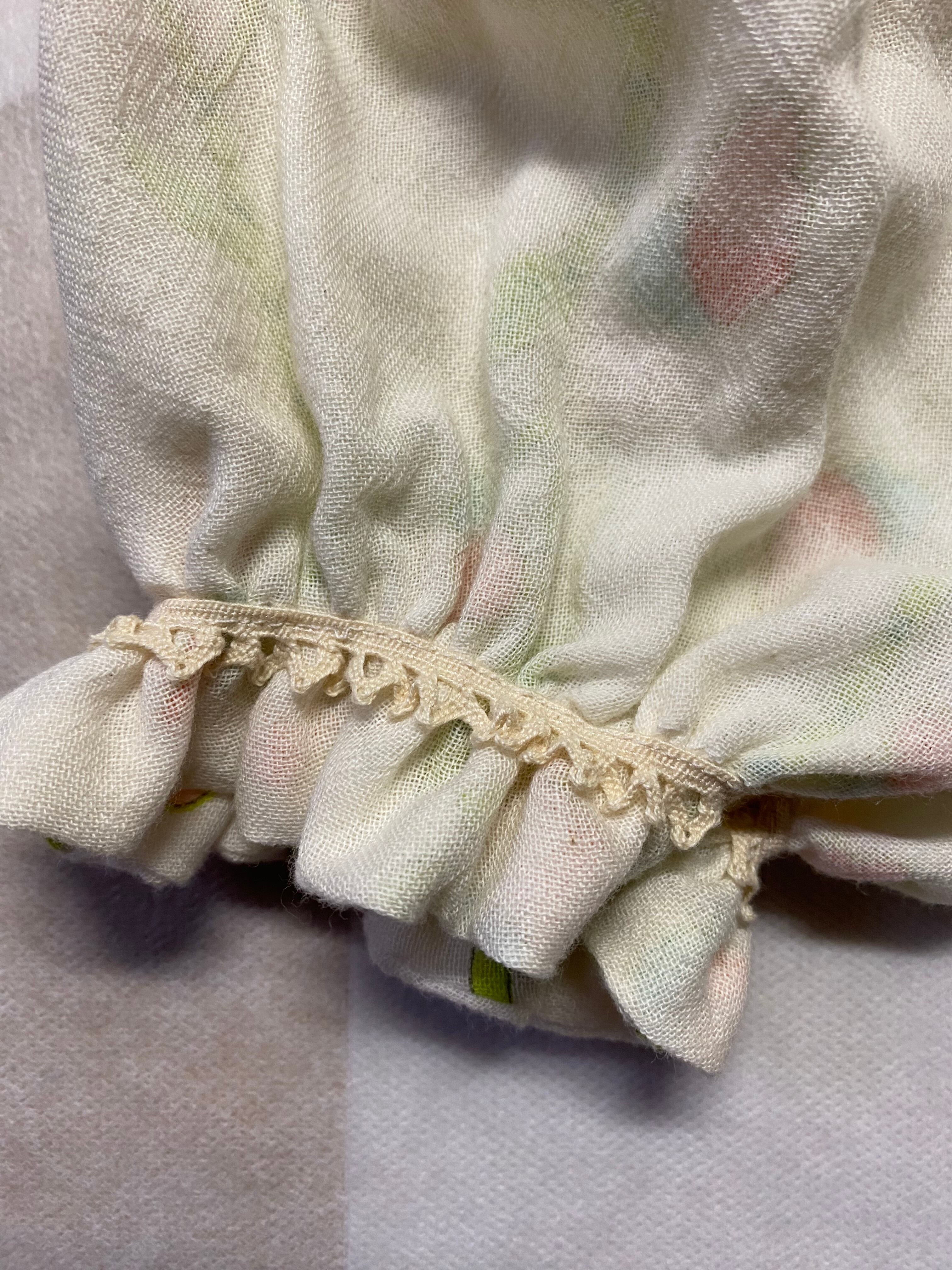 プリントしたガーゼ生地の上に無地のガーゼ生地をのせた2枚仕立てです。オブラートのようにふんわりしたイメージに仕上げました。