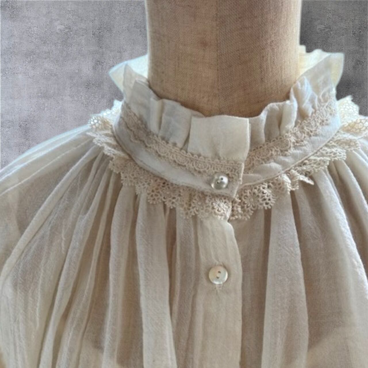 立ち襟にはフリル、ケミカルレース(オーガニックコットン)を